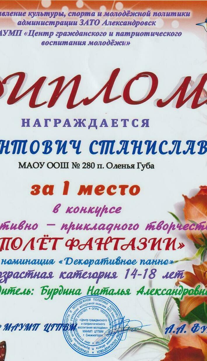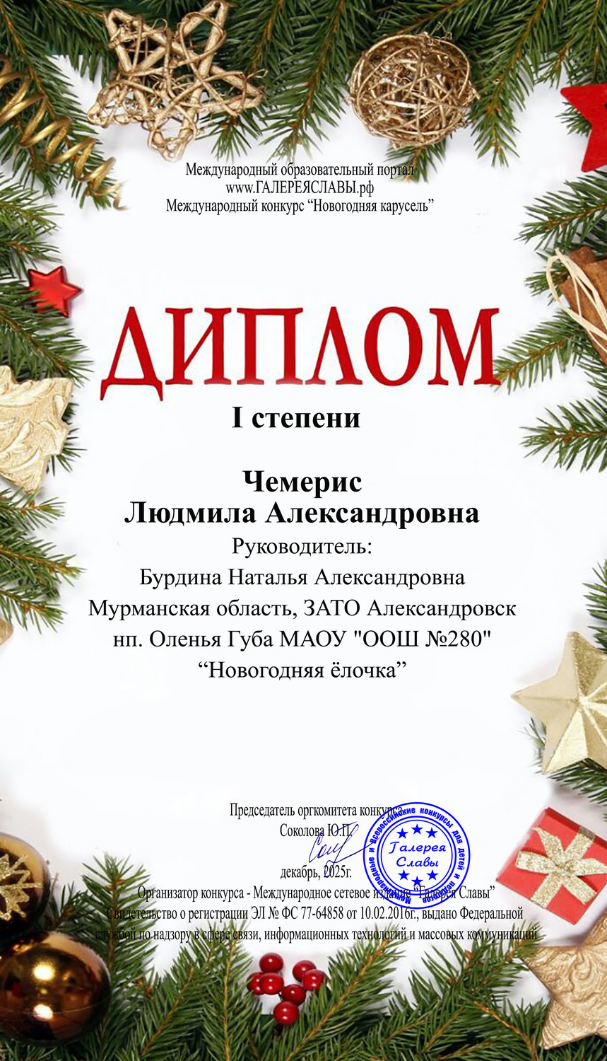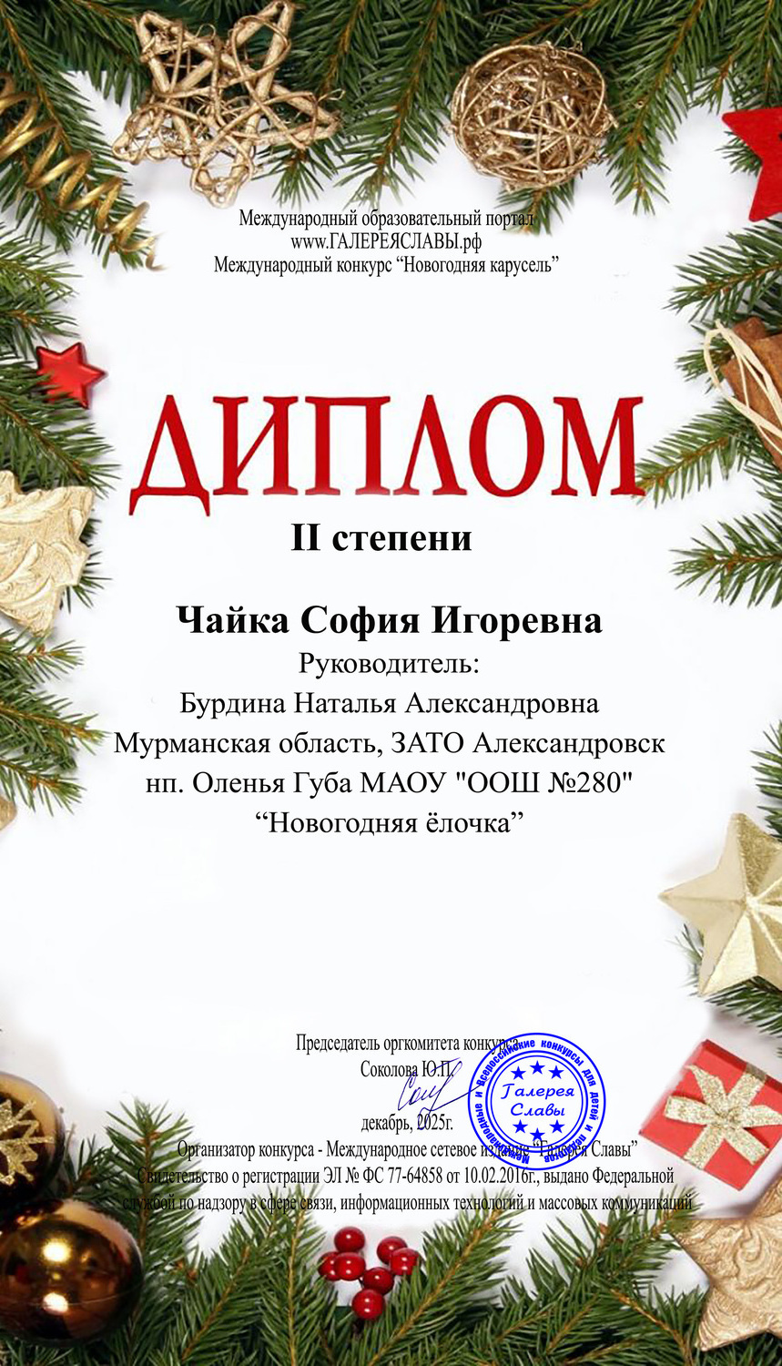 За пределами школы моя жизнь тоже насыщена и интересна. Регулярно занимаюсь стретчингом и силовыми тренировками, поддерживая хорошую физическую форму и энергию. Моё увлечение интеллектуальными и настольными играми реализуется в роли капитана команды «Настойка разума» в «Чайка квиз» города Полярного — это отличный способ развивать логическое мышление и навыки командной работы. А для души я люблю печь вкусные торты и пирожные, радуя близких и друзей своими кулинарными творениями.